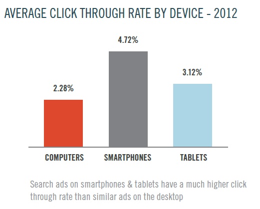 Per capire in che modo possono esserci utili questi dati è opportuno considerare le differenze fra una ricerca effettuata da un computer tradizionale e una effettuata via mobile: smartphone e tablet hanno un display di dimensioni ridotte e quindi minor spazio dedicato agli annunci sulla pagina. Nonostante ciò, tutti i dati del report della Marin Software confermano che gli utenti che navigano in mobilità sono più propensi a cliccare i risultati sponsorizzati rispetto agli altri, come indicato dal grafico sul Click Through Rate (CTR) medio in base ai device adoperati.