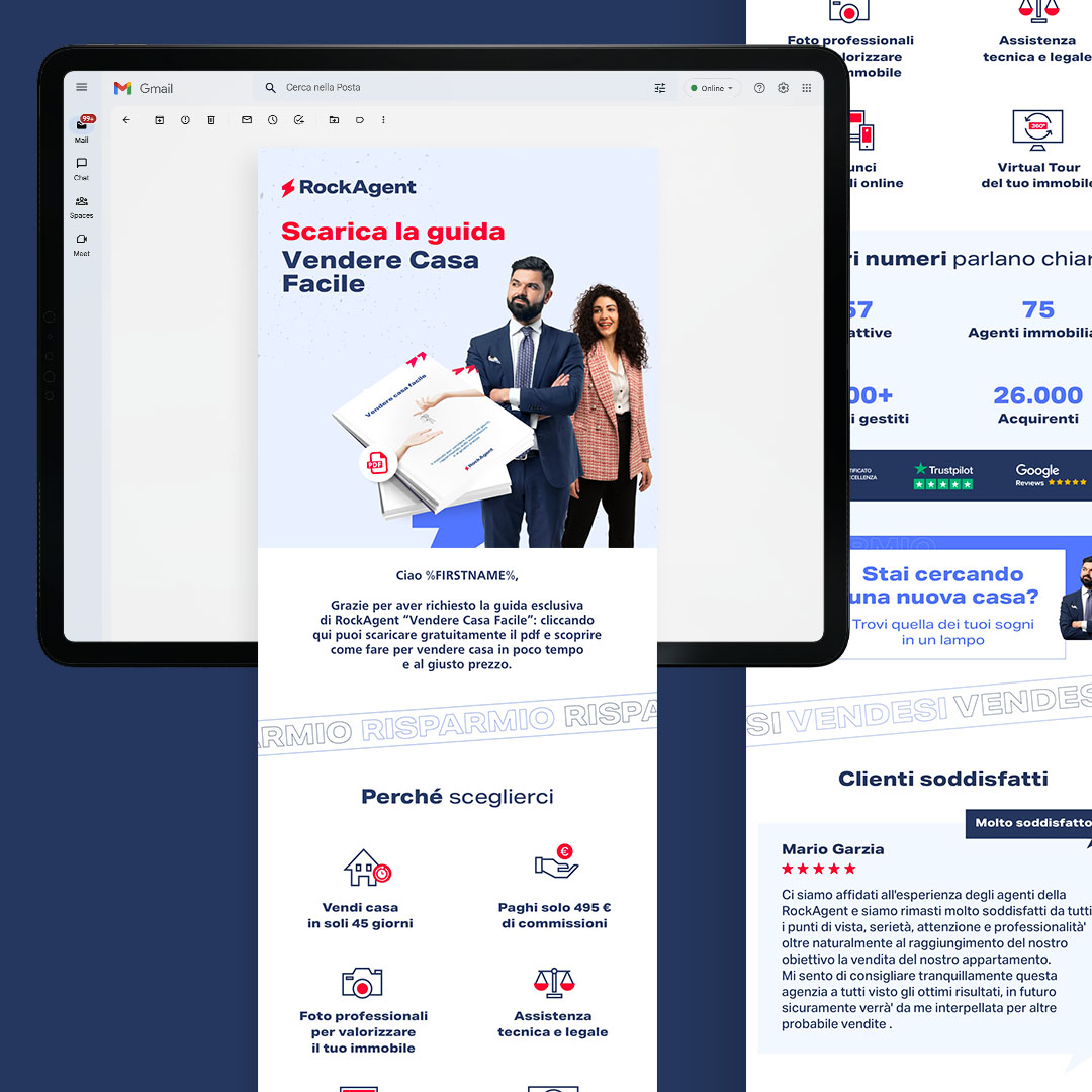 Per efficentare il processo di acquisizione dei nuovi clienti, abbiamo integrato nel funnel dei flussi di Lead Nurturing tramite Email Marketing Automation. Attraverso specifici follow up manteniamo la relazione con i potenziali clienti, agendo con specifici contenuti e leve per aumentare fiducia, autorevolezza e valore percepito del brand Roack Agent.