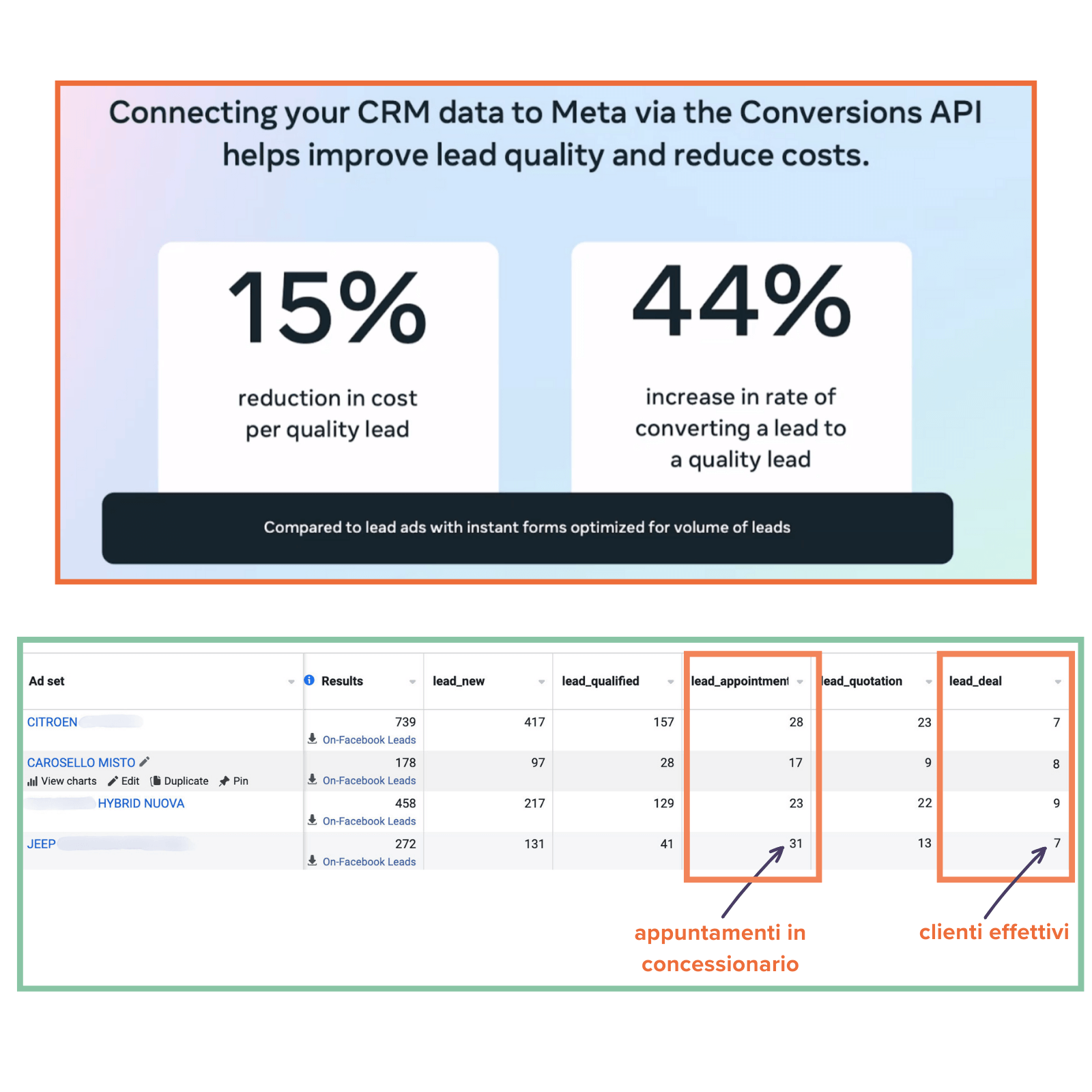 Questa soluzione Martech ci consente di misurare il CPL, il CPAPP (costo appuntamento) e il CAC (costo di acquisizione cliente) di ogni campagna, fornendo maggiori segnali all’algoritmo di Meta Ads.