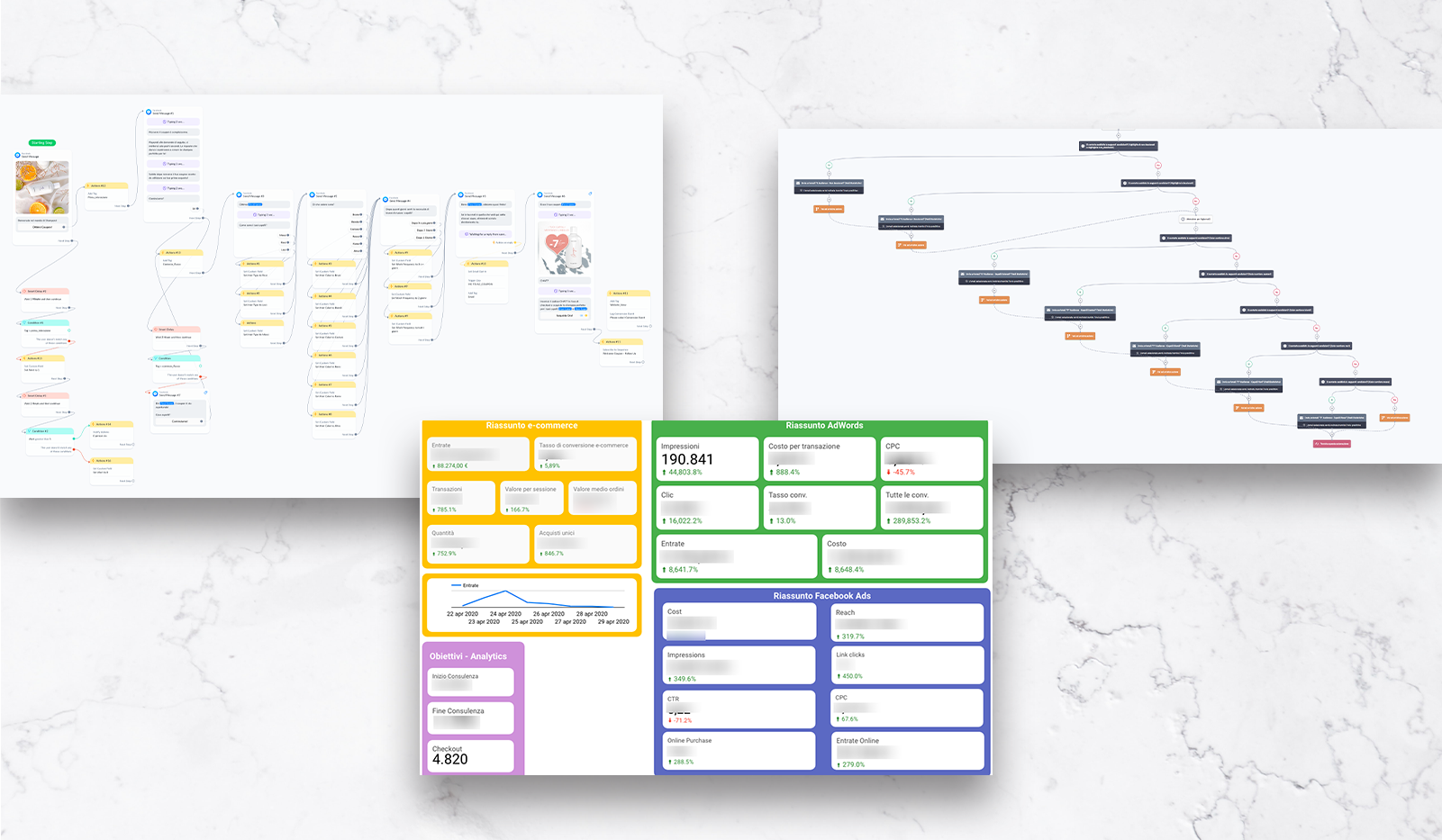 Per massimizzare il ROAS delle campagne di advertising, comprendere il customer journey e successivamente capitalizzare al meglio segmenti di pubblico e liste utenti/clienti, abbiamo costruito una Business Intelligence molto sofisticata e totalmente integrata con tutte le attività e canali di marketing.