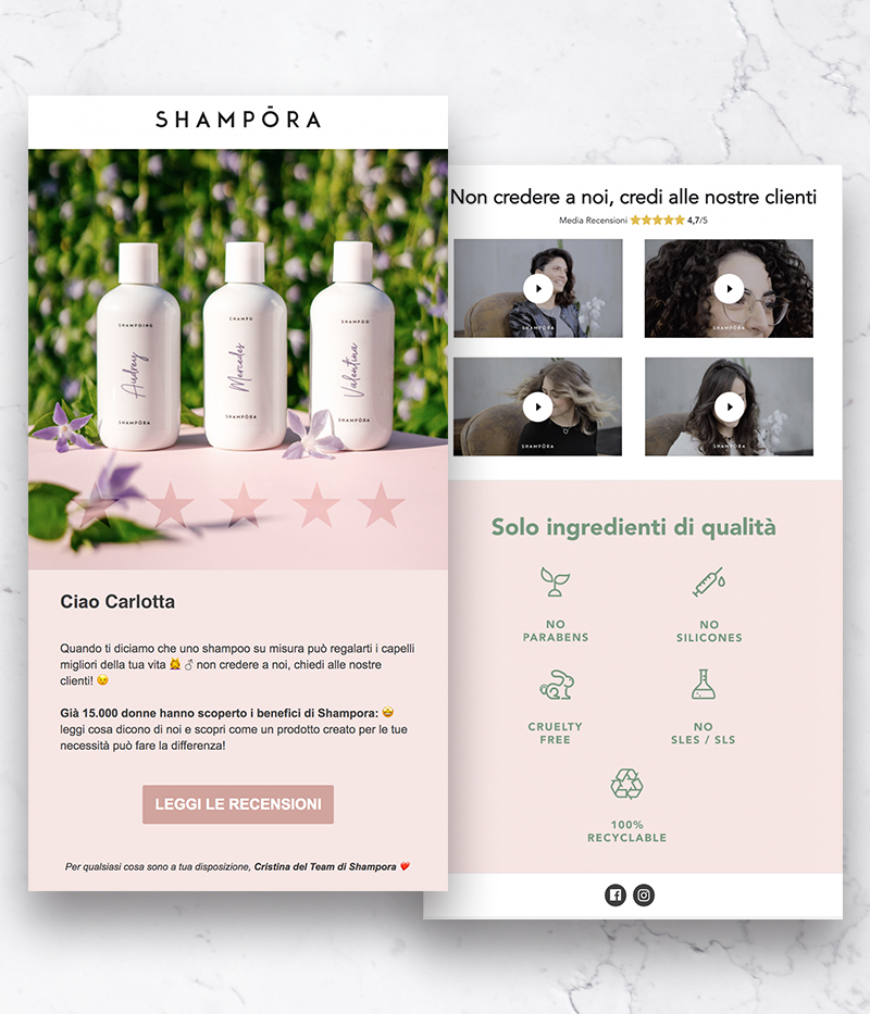 Al contempo i due strumenti vengono utilizzati per mantenere la relazione con i clienti e aumentare il valore della customer base Shampora. Ciò avviene con un piano editoriale e una comunicazione serrata che include storytelling, news di prodotto, promozioni, coupon sconto e referral program.