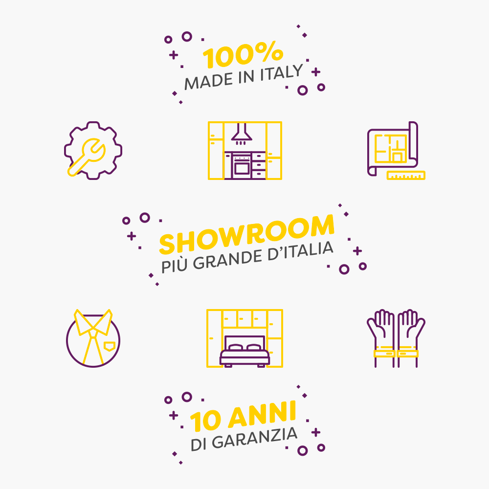 Tra le leve principali del posizionamento abbiamo individuato i seguenti elementi differenzianti: prodotti 100% Made in Italy, lo showroom più grande d’Italia, 10 anni di garanzia.