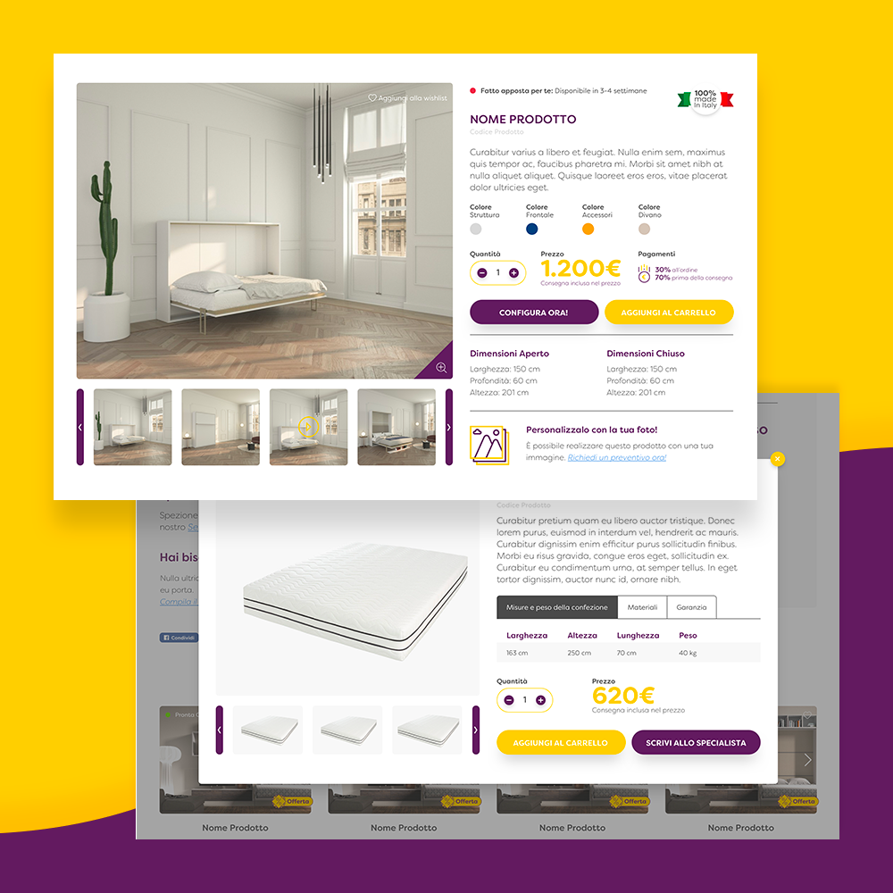 Il progetto si è rivelato particolarmente sfidante e complesso, poiché parliamo di uno shop online dedicato alla vendita di mobili a scomparsa, una tipologia di prodotti che tipicamente si acquistano presso mobilifici e negozi di arredamento, i quali hanno personale dedicato che si occupa di tutto: rilievo delle misure, scelta dei modelli/collezioni con relativi materiali e finiture, spedizione e soprattutto montaggio a casa del cliente con personale altamente specializzato.